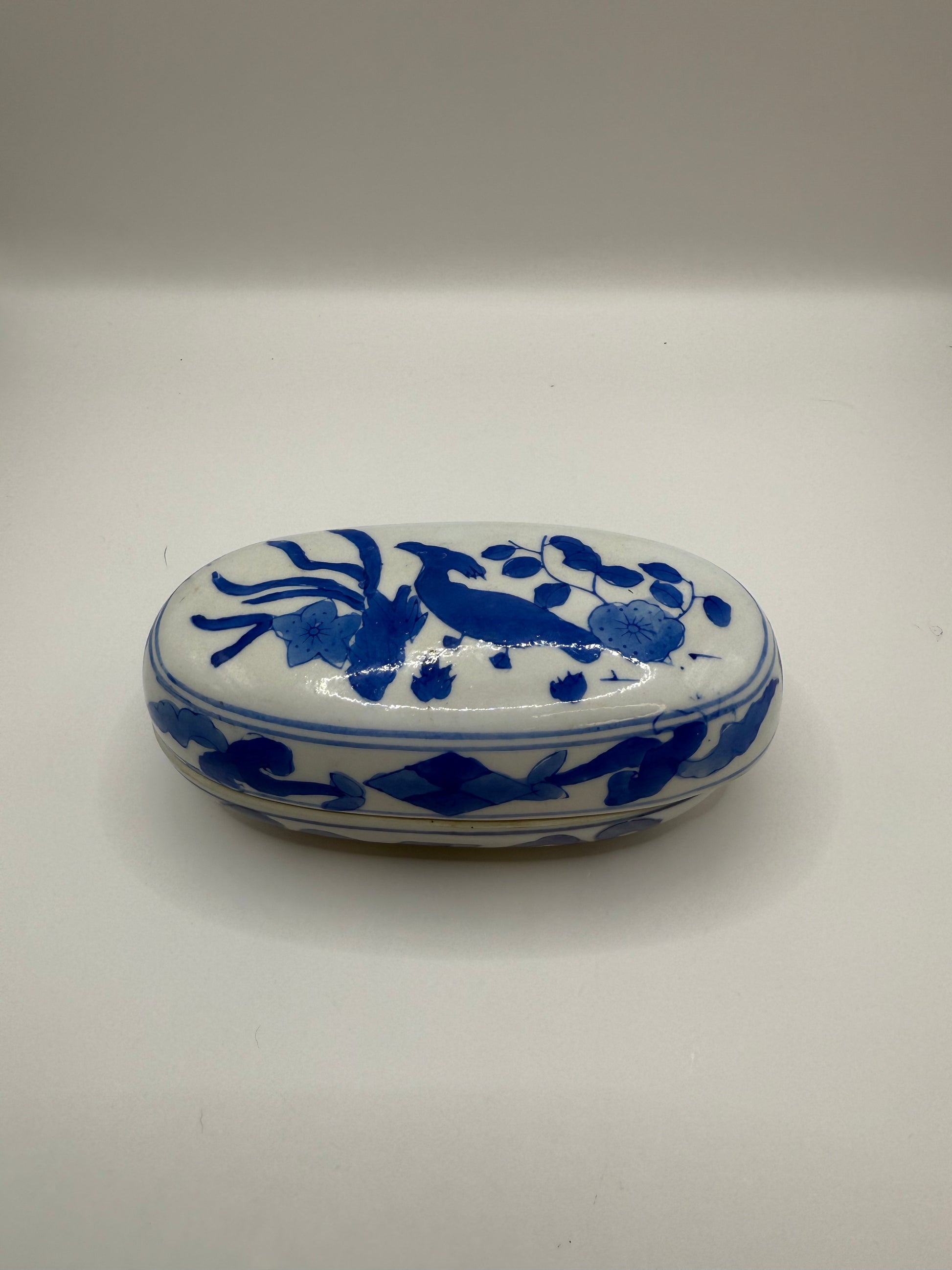 Antique Chinese blue and white porcelain trinket box, featuring a hand-painted bird and floral design motif