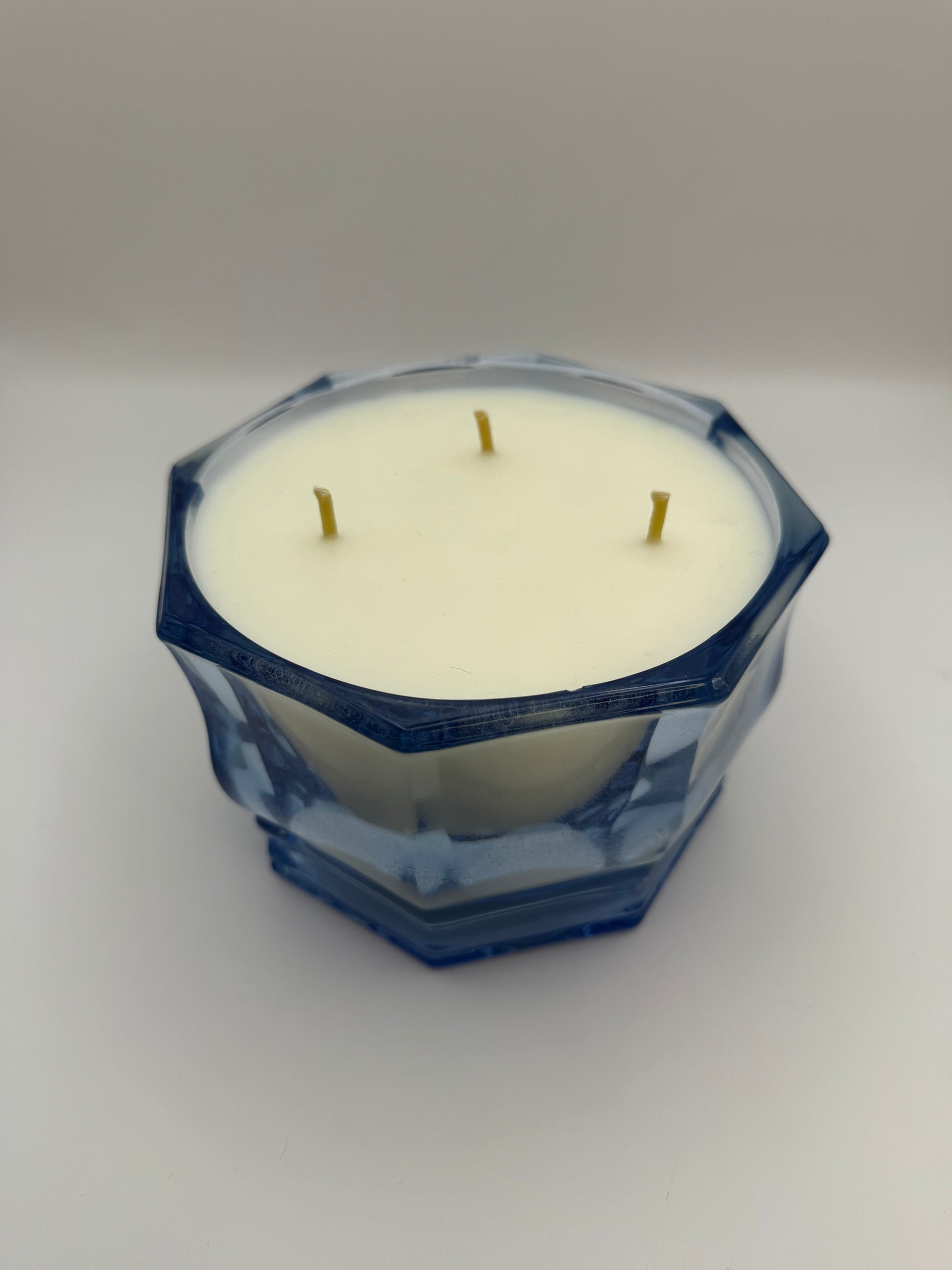 This bold blue Indiana glass vessel adds a pop of character while the triple wick ensures a radiant, cozy glow