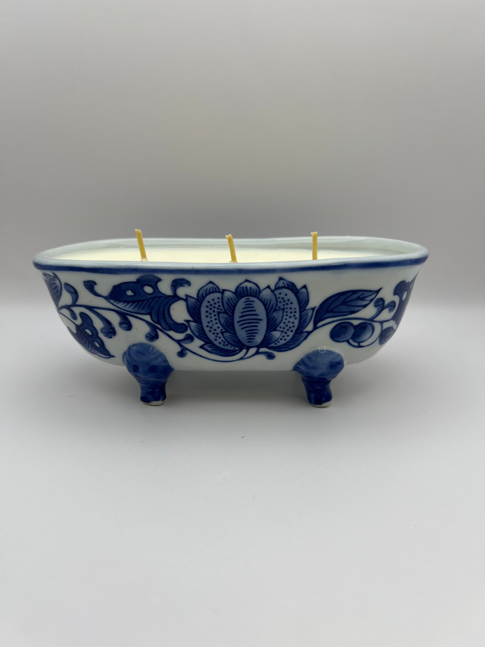 This triple wick candle is hand-poured into a vintage blue and white floral vessel, perfect for adding timeless charm to any room!