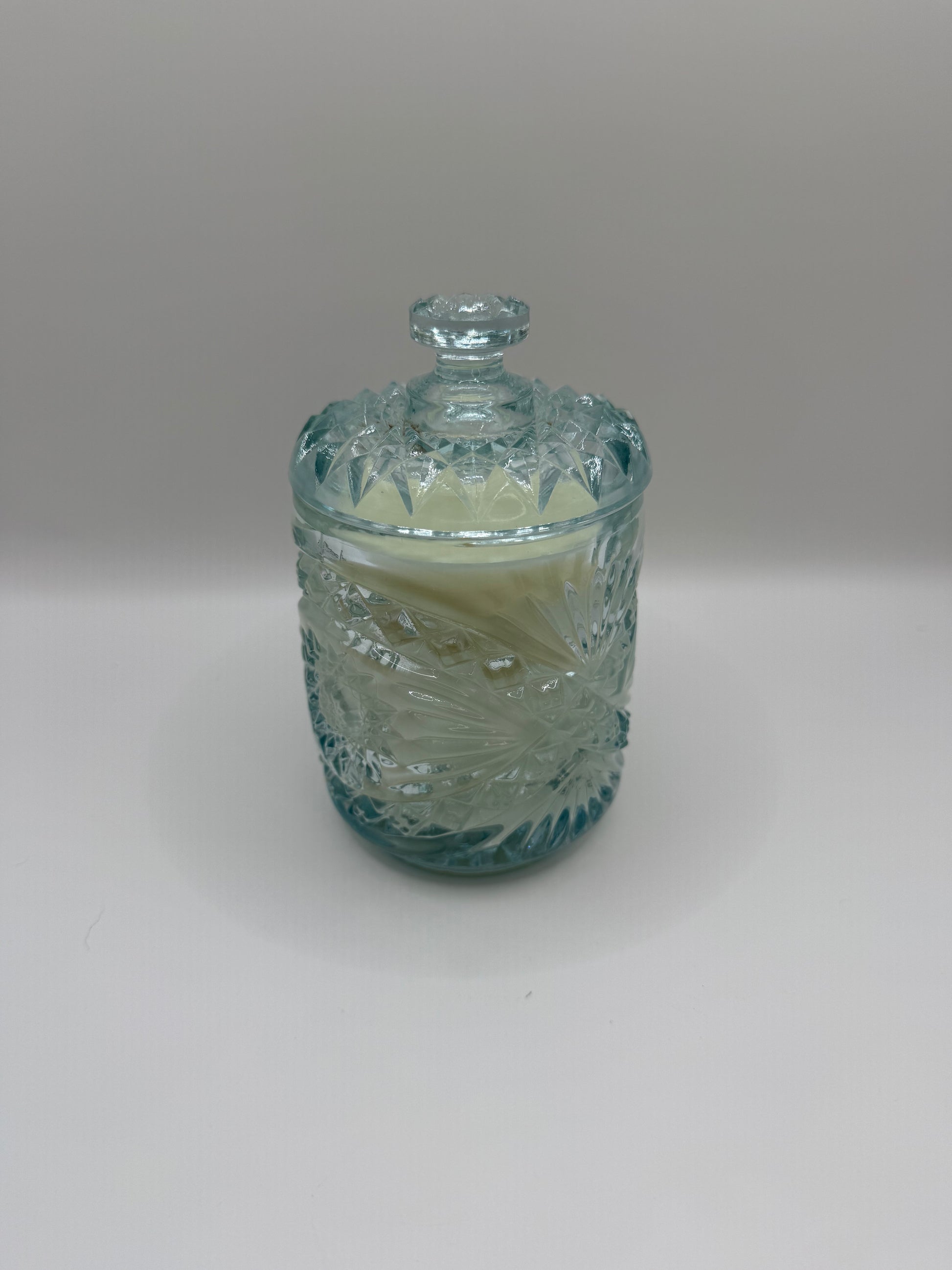 This vintage aqua cut-glass candle adds a touch of sparkle and a warm, clean-burning glow to any room!