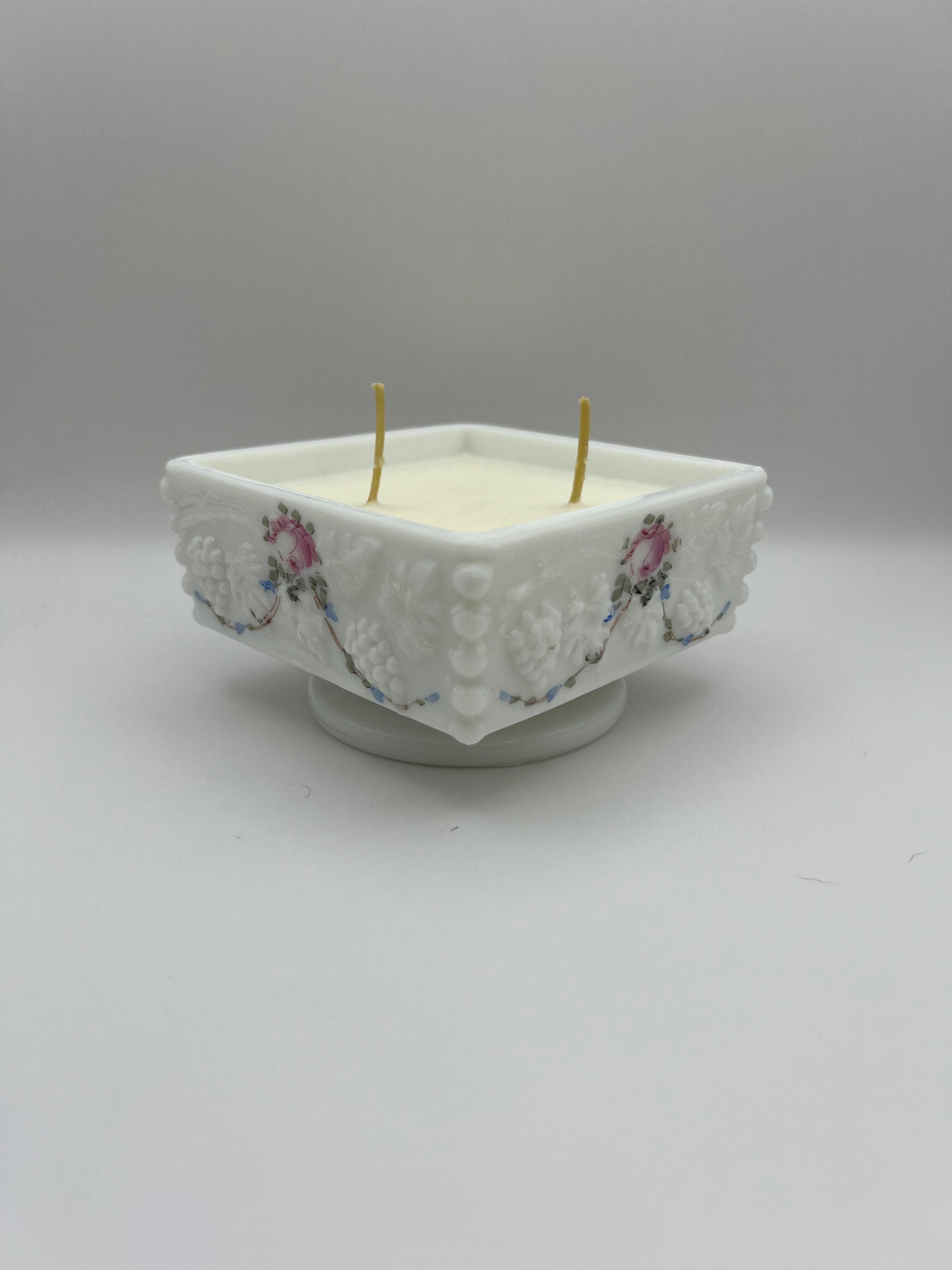 Delicate and feminine, this hand-painted milk glass candle is all soft charm and timeless beauty - a sweet addition to any space.